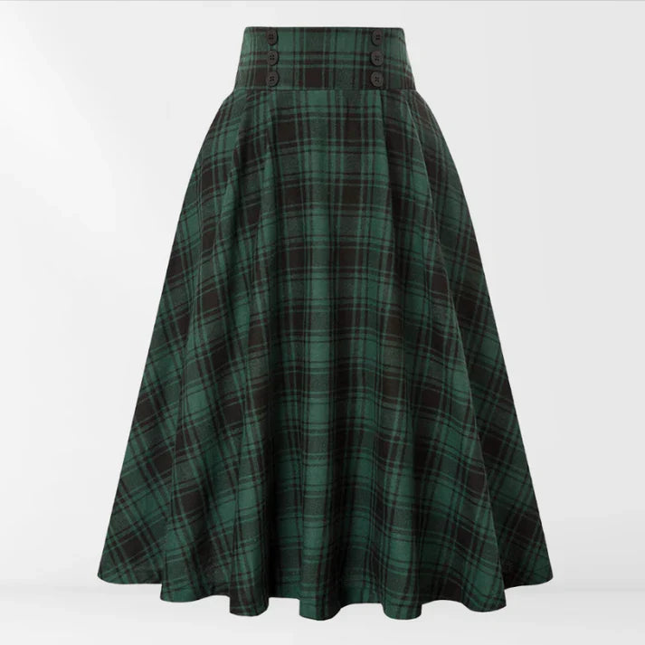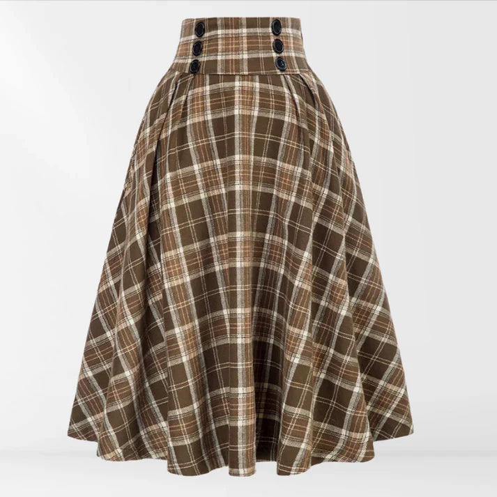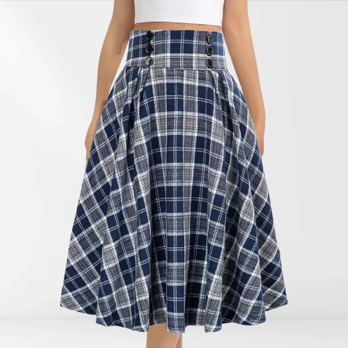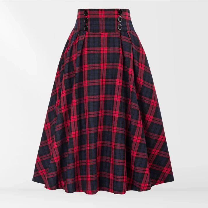 Der Lavender Rock überzeugt mit einem hohen Bund und zeitlosem Karomuster. Die Midilänge eignet sich perfekt für verschiedenste Outfits – ob im Büro oder in der Freizeit.